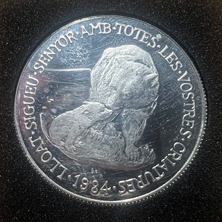 Moneda conmemorativa de Andorra del año 1984. - Diseño de un oso y su cría. - Inscripción en catalán: SENTOR AMB TOTES LES VOSTRES CRIATURES - Año: 1984 - Denominación: 20 diners