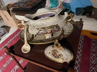 Elegante sopera antigua con un diseño floral muy detallado. Incluye su plato y cucharón. - Acabado en blanco agrietado con detalles dorados. - Decoración de flores pintadas a mano. - Pieza decorativa con mucho encanto.