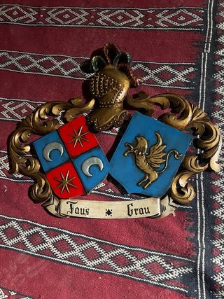Decoración de pared con un escudo familiar tallado en madera. - Diseño con casco de caballero y dos escudos. - Uno de los escudos presenta lunas y estrellas rojas y azules. - El otro escudo muestra un grifo dorado sobre fondo azul. - Incluye una banda con la inscripción Faus Grau.