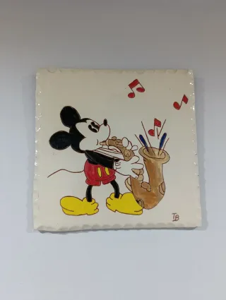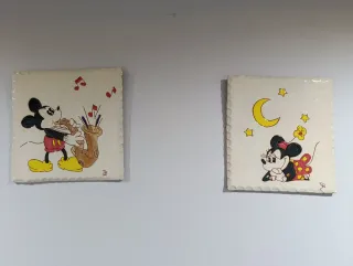 Conjunto de 2 baldosas decorativas pintadas a mano, estilo retro años 90. Motivos clásicos tipo Disney, acabado cerámico brillante y firma del autor. Medidas: 19 × 19 cm cada pieza. Ideales para decoración vintage, habitación infantil o coleccionistas de piezas artesanales. Se venden juntas. Buen estado de conservación. Entrega en mano o envío.