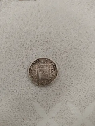 Moneda de 50 céntimos de España. - Diseño con escudo. - Inscripción REI CONST. DE ESPAÑA.