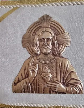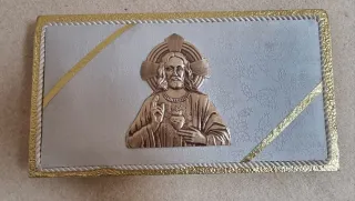 Antigua caja decorada con una imagen de Cristo en metal y relieve. El diseño presenta detalles dorados y un borde trenzado. Buen regalo para Navidad. Ideal para guardar pequeños recuerdos sentimentales. - Medidas: 26x14x3cm - Imagen central de Cristo con Sagrado Corazón. - Marco exterior dorado y trenzado. - Fondo texturizado en tono claro.