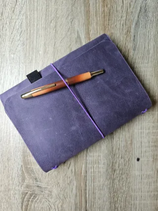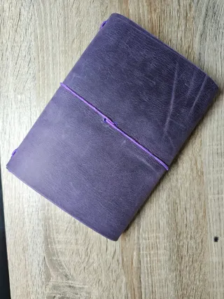 Agenda tipo Louise Carmen en tamaño A5, con un bonito color morado. - Cubierta de piel. - Cierre con goma elástica. - Incluye un portaboligrafos.