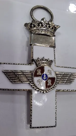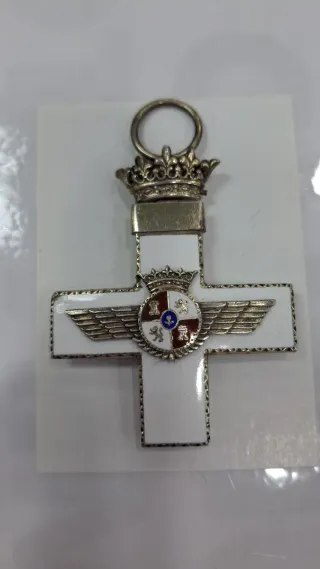 Cruz del Mérito Aeronáutico con distintivo blanco. - Diseño de cruz con esmaltado blanco. - Incluye corona y alas. - Detalle de escudo central con emblemas.