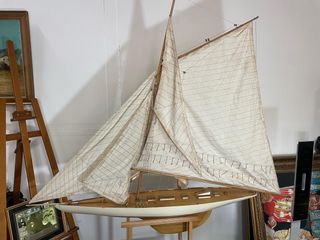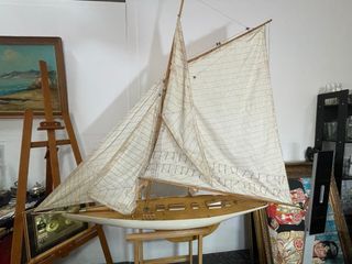Gran maqueta de velero decorativo en madera, de gran tamaño y fuerte impacto visual. Medidas aproximadas: - Ancho: 1,60 m - Alto: 1,40 m Se vende SOLO el barco, sin soporte o peana. Pieza ideal para: - Decoración náutica - Restaurantes, hoteles o escaparates - Casas grandes, estudios u oficinas - Proyectos de restauración o decoración Estado: Estructuralmente completo y estable. Las velas presentan manchas y signos evidentes del paso del tiempo, visibles en las fotos. No está restaurado. Se vende tal cual, lo que se refleja en el precio. Materiales: Madera, tela y cuerdas. Debido a su tamaño y fragilidad, se recomienda recogid