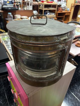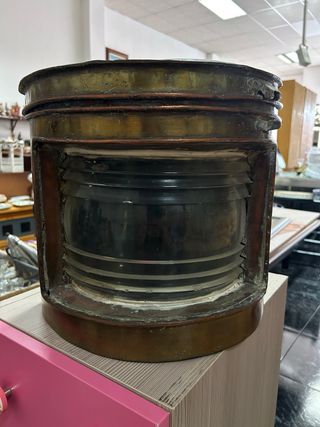 Farol náutico antiguo de barco, original, fabricado en metal (latón/bronce) con cristal tipo lente Fresnel. Pieza pesada y robusta, con una pátina espectacular que le da mucho carácter. Ideal como objeto decorativo para interiores estilo industrial, marinero, vintage, bares, restaurantes o escaparates. Se conserva en estado original, con marcas del tiempo acordes a su antigüedad. No se ha probado la instalación eléctrica, se vende como pieza decorativa o para restaurar. Artículo difícil de encontrar hoy en día, muy decorativo y con presencia. 📍 Preferible entrega en mano por peso y tamaño.