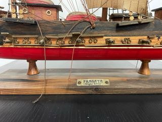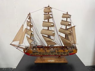 Gran maqueta naval decorativa de una fragata de estilo siglo XVIII, fabricada en madera con velas de tela, cabos, herrajes, cañones y cubierta detallada. Base maciza de madera con placa “Fragata – Siglo XVIII”. Pieza grande y muy vistosa, ideal para decoración náutica, casas amplias, despachos, restaurantes, bares o escaparates. Trabajo artesanal con gran nivel de detalle en mástiles, jarcias y velamen. Se conserva en buen estado general, con pequeñas señales normales del tiempo que le aportan carácter. Se vende como pieza decorativa. Por tamaño y fragilidad se recomienda entrega en mano. Objeto decorativo difícil de encontrar