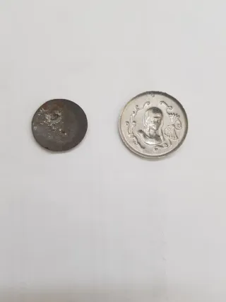 Moneda de 2 pesetas del Gobierno Provisional. Creo que mas que posiblemente es falsa de época, la he pesado y pesa solo 8 gramos. Es la de la izquierda. - Diseño con escudo. - Inscripción 100 PIEZAS EN KILOGRAMO y 2 PESETAS.