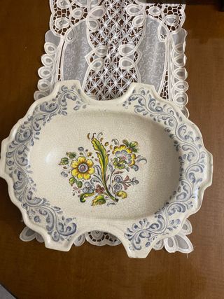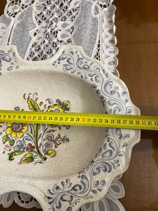 Precioso plato antiguo de cerámica estilo Talavera. Presenta un diseño floral en el centro con detalles en azul en el borde. - Cerámica con acabado craquelado. - Decoración floral pintada a mano. - Borde con motivos azules. - Pieza decorativa única.
