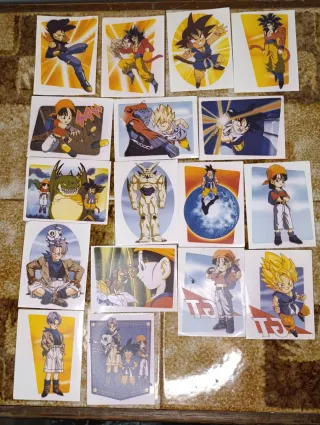 Colección de 14 pegatinas de Dragon Ball GT, provenientes de chicles Boomer. - Personajes icónicos de la serie. - Diseños variados.