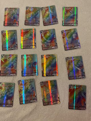 Conjunto de cartas Pokémon VMAX con arte de arcoíris. Incluye varias cartas raras y coleccionables. - Cartas Pokémon VMAX. - Diseño de arcoíris. - Variedad de Pokémon 16 cartas