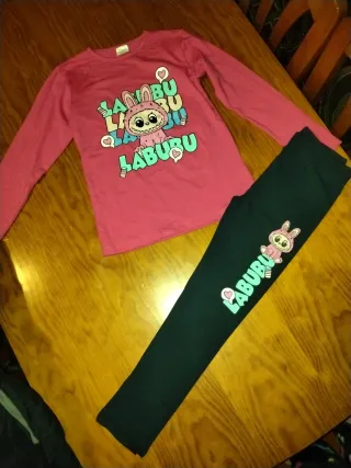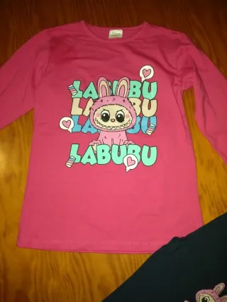 Conjunto infantil de camiseta de manga larga y mallas. - Camiseta rosa con estampado de Labubu. - Mallas azul marino con estampado de Labubu.