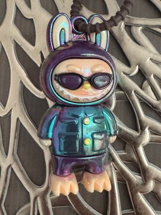 Figura coleccionable de Labubu. Labubu collectible keychain from The Monsters series, produced by Pop Mart. - Diseño con capucha de orejas. - Acabado iridiscente. - Detalle de gafas de sol.