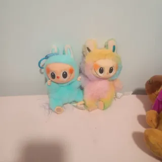 Dos adorables muñecos Labubu. - Uno en color azul. - Otro con diseño arcoíris.