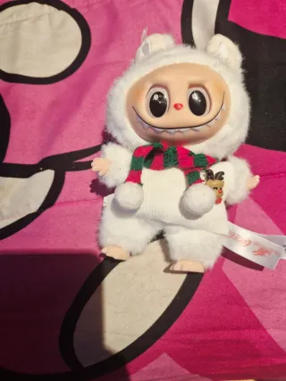 Adorable peluche de Labubu con temática navideña. - Diseño de personaje. - Bufanda a rayas rojas y verdes. - Adorno de reno en la bufanda.