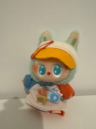 Adorable peluche de Labubu con un diseño tierno y divertido. - Peluche suave de color gris y blanco. - Lleva una capucha azul tejida. - Detalle de dos botones azules en la prenda.