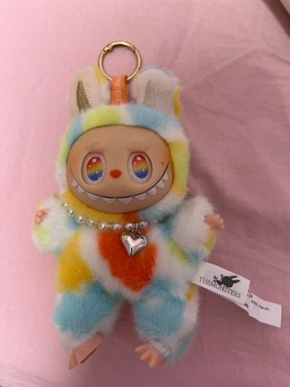 Adorable peluche NUEVO de Labubu con un diseño colorido y divertido. - Peluche suave y esponjoso. - Colores del arcoíris en todo el cuerpo. - Incluye un aro para colgar.