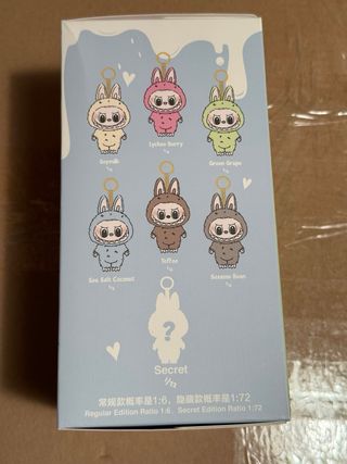 Caja de la colección Exciting Macaron de Pop Mart, con el personaje Labubu. -bolsa sin abrir -solo abierta caja para poder ver color -ticket de compra en tienda oficial barcelona -precio unidad 30 -color sesame bean / sea Salt coconut - Diseño de The Monsters. - Personaje Vinyl Face.