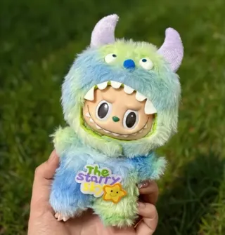 Este es un traje diseñado para la muñeca Labubu. El diseño es colorido y divertido. - Traje de peluche con estampado tie-dye. - Incluye un parche The Starry Sky con una estrella. - Cuernos morados y detalles de ojos y nariz azules.