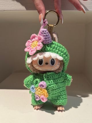 Llavero de Labubu hecho a crochet, con detalles aplicados con fieltro. - Perfecto para decorar bolsos, mochilas y otros accesorios. - Materiales: Poliamida suave, algodón orgánico, fieltro y relleno de poliéster. - Hipoalergénico: No tiene lana, alpaca u otras fibras animales. - Llavero de anilla para que te lo lleves contigo a todas partes