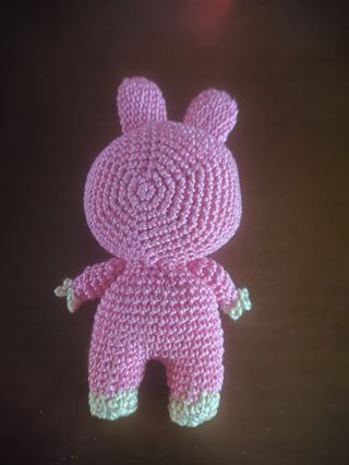 Labubu rosa tejida a mano con ganchillo.