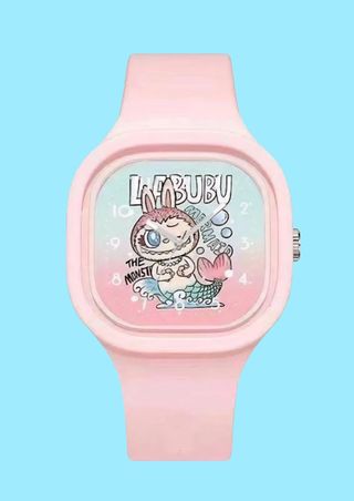 Reloj analógico de color rosa claro con ilustración de Labubu en verde claro en la esfera. Diseño original y divertido, ideal para fans del personaje o para quienes buscan un accesorio diferente y alegre. Correa suave al tacto y carcasa ligera que se adapta cómodamente a la muñeca. La correa mide 25 cm de largo. Nuevo sin uso.