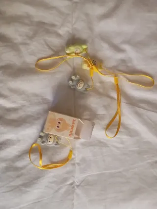 Set de mini figuras Labubu con cordones. Uno de ellos en su caja. - Figuras de colores variados. - Incluye cordones para colgar.