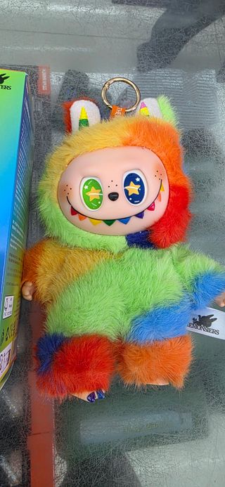 Figura de peluche Labubu con un diseño vibrante y alegre. Todos son cajas ciegas es decir selladas tanto por dentro como por fuera. Hasta agotar existencias - Colores del arcoíris en todo el peluche. - Ojos con diseño de estrellas. - Orejas con detalles de colores.