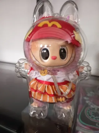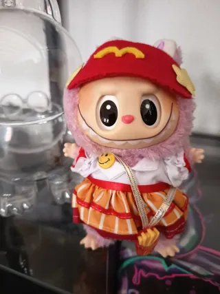 Figura de Labubu con temática de McDonald's, no es original. - Incluye funda protectora. - Incluye gorra roja con logo de McDonald's. - Vestimenta con falda naranja y blanca.
