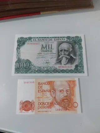 Dos billetes del Banco de España, uno de 1000 pesetas y otro de 200 pesetas. - Billetes españoles. - Serie 1000 pesetas: 6X9031817. - Serie 200 pesetas: 5004889.
