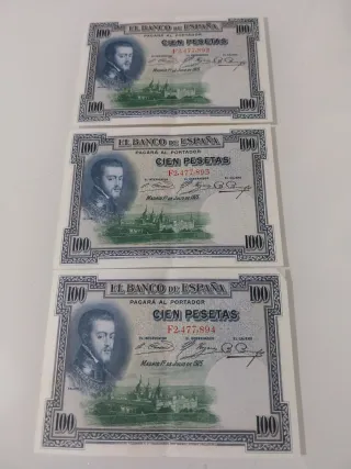 Conjunto de tres billetes de 100 pesetas del Banco de España, emitidos en 1925. Son un trío correlativo. - Serie F2.477.892 - Serie F2.477.893 - Serie F2.477.894 - Fecha de emisión: 10 de Julio de 1925 - Emitidos en Madrid