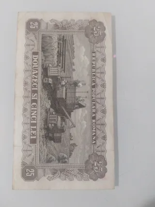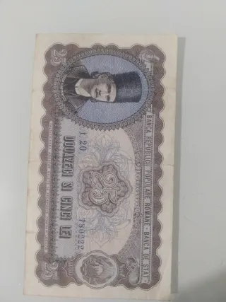 Billete de 25 Lei de Rumanía, emitido por la Banca Republicii Populare Romane. - Denominación: Douazeci si Cinci Lei. - Número de serie: 780222. - Diseño con retrato de Tudor Vladimirescu.