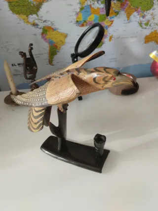 Preciosa escultura de águila tallada en cuerno de bufalo y pintada a mano Ideal para coleccionistas o como elemento decorativo. - Diseño detallado de las plumas. - Tonos dorados y marrones. - Base negra para exhibición.