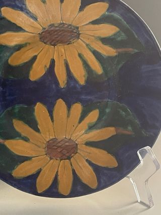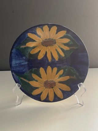 Precioso plato de cerámica decorado con girasoles. - Diseño pintado a mano. - Tonos azules y amarillos. - Ideal para decoración. - 18 cm de diametro