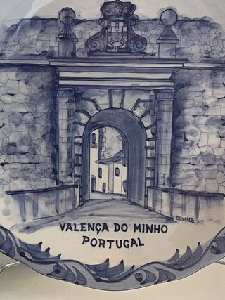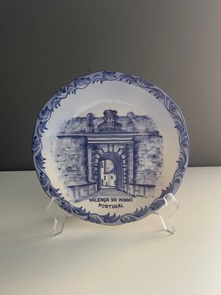 Plato decorativo con diseño en azul y blanco que representa Valença do Minho, Portugal. - Motivo arquitectónico. - Borde decorado con motivos vegetales. - Ideal para coleccionistas o como adorno.