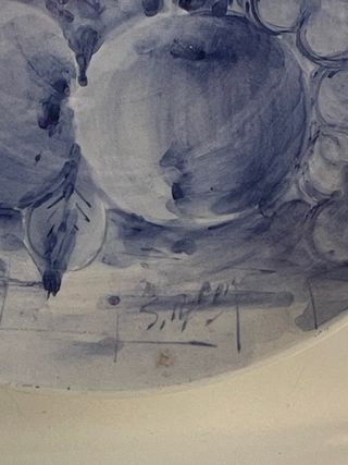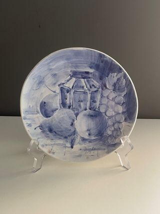 Precioso plato decorativo con un bodegón pintado a mano en tonos azules y blancos. La firma del artista está presente en la pieza. - Diseño de bodegón con frutas y jarrón. - Pintura a mano. - Colores azul y blanco.