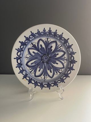 Plato decorativo con un diseño floral en tonos azules y blanco. - Diseño central de flor estilizada. - Borde con motivos ornamentales. - Base blanca.