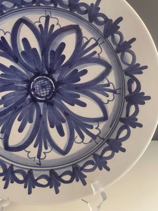 Plato decorativo de cerámica artesanal de Fajafauza, Granada. Presenta un diseño tradicional con motivos florales y un ave central. - Cerámica pintada a mano. - Diseño inspirado en la tradición granadina. - Pieza de colección. - 30 cm de diametro