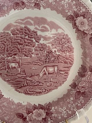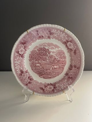 Precioso plato de cerámica inglesa de la marca Adams. Presenta un diseño campestre con flores y un paisaje rural con vacas. - Diseño floral en el borde. - Escena campestre en el centro. - Color rosa. - ha sido restaurado