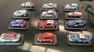 Colección de 12 coches de rally en miniatura, cada uno presentado en su base individual. - BMW M3 - Skoda Fabia WRC - Renault 5 Maxi Turbo - Fiat 131 Abarth - Toyota Celica Turbo 4WD - Lancia Delta Integrale - Citroen Xsara WRC - Citroen C2 S1600 - Ford Focus WRC - Lancia Stratos - Subaru Impreza WRC - Porsche 911 Carrera RS