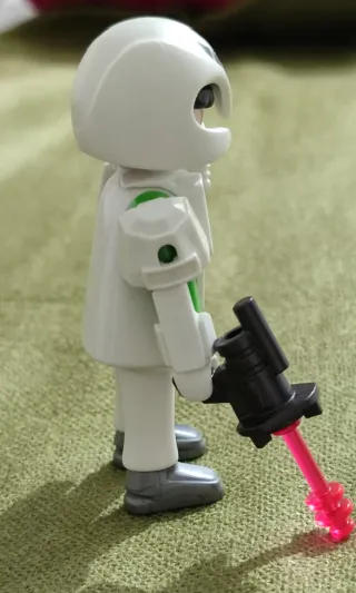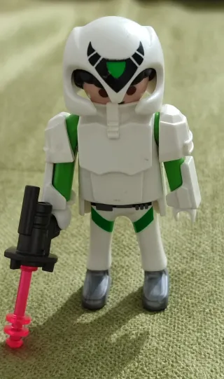 Figura de viajero espacial de Geobra, fabricada en 1982. - Diseño futurista en blanco y verde. - Incluye casco y armadura detallada. - Accesorios de arma. - Botas grises.