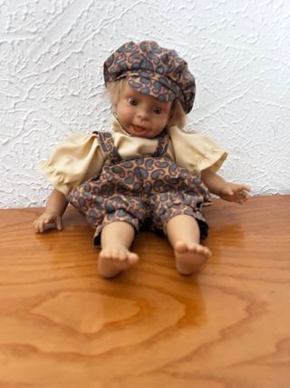 Este muñeco de porcelana representa a un niño con un atuendo encantador. - Cuerpo de porcelana. - Ropa de estilo vintage con estampado. - Gorro a juego.