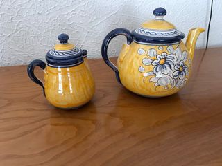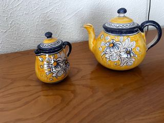 Conjunto de cerámica pintada a mano, ideal para añadir un toque de color a tu mesa. - Tetera con tapa. - Jarra pequeña. - Diseño floral en tonos amarillos y azules.