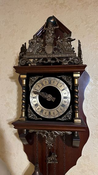 Pieza de colección reloj de pared de estilo holandés. Destaca por su elaborada ornamentación en bronce. - Diseño detallado con figuras. - Esfera con números romanos. - Colgante y péndulo Las figuras se mueven con las horas. Da las horas y los cuartos. Estado PARACTICAMENTE NUEVO NECESITA ENGRASE y listo No se envia Solo venta con recogida PRECIO A CONVENIR