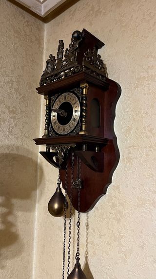 Reloj de pared con mecanismo Westminster y sonería. - Diseño clásico con esfera dorada. - Números romanos. - Adornos dorados en las esquinas. Acepto cambio por algo que me interese.