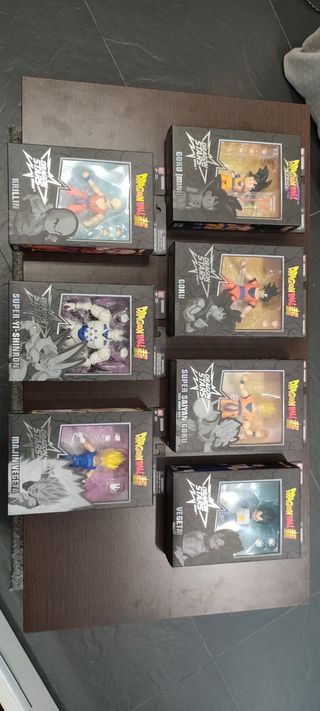 Colección de 7 figuras de acción de Dragon Ball de la línea Dragon Stars de Bandai. Incluye personajes icónicos de la serie. - Krilin - Goku (Mini) - Goku - Super Saiyan Goku - Super Yi-Shinron - Majin Vegeta - Vegeta
