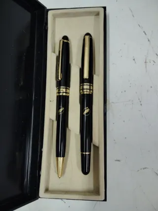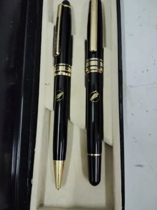Elegante juego de pluma y bolígrafo en color negro con detalles dorados. - Diseño clásico y sofisticado. - Incluye estuche. - Ideal para coleccionistas o como regalo.