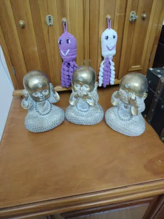 Conjunto de tres figuras de budas con las manos cubriendo ojos, oídos y boca. - Diseño no veo, no oigo, no hablo. - Acabado dorado y texturizado. 13 cm alto x 9 ancho