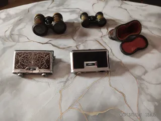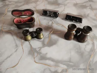 Conjunto de prismáticos de estilo vintage. - Incluye una funda de cuero con interior de satén. - Dos pares de prismáticos de metal y latón.