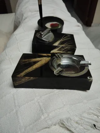 Conjunto de escritorio antiguo con varios elementos. Escribania - Mechero plateado. - Cenicero con diseño de espigas. - Boli negro con detalles dorados. - Base decorada con espigas.